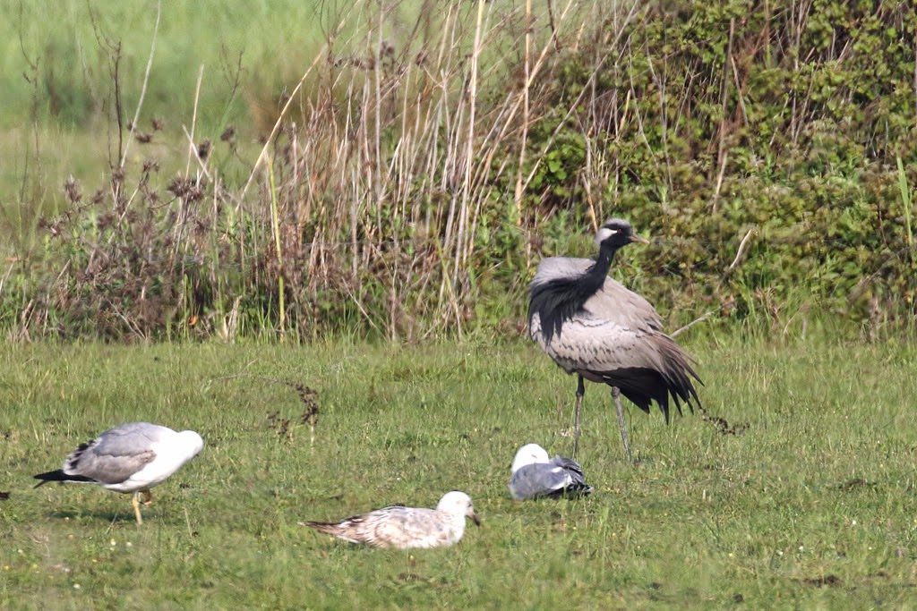Whilst having breakfast news reached us that the Demoiselle crane was on the Christou river, (west river) so we quickly grabbed the gear of set off, only half a km away. It was in a small field with a couple of white storks and gulls but was not easy to see over the high reeds in the dyke. I got a few shots but vegetation was often in the way and the weather was dull, however we all had our fill and time to move on.